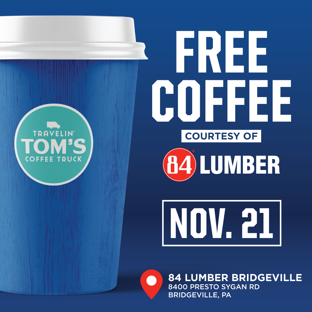 Four Pittsburgh-area 84 Lumber locations will offer free coffee, courtesy of the company, from 10 a.m. to 2 p.m. on Nov. 21, 2025, at the following locations: